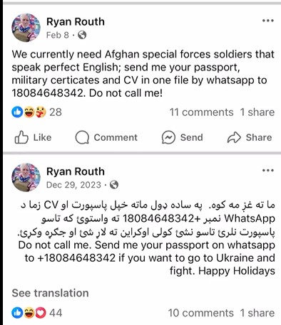 Ryan Routh Facebook Page Shows He Recruited Afghan Soldiers with PASSPORTS to Fight in Ukraine